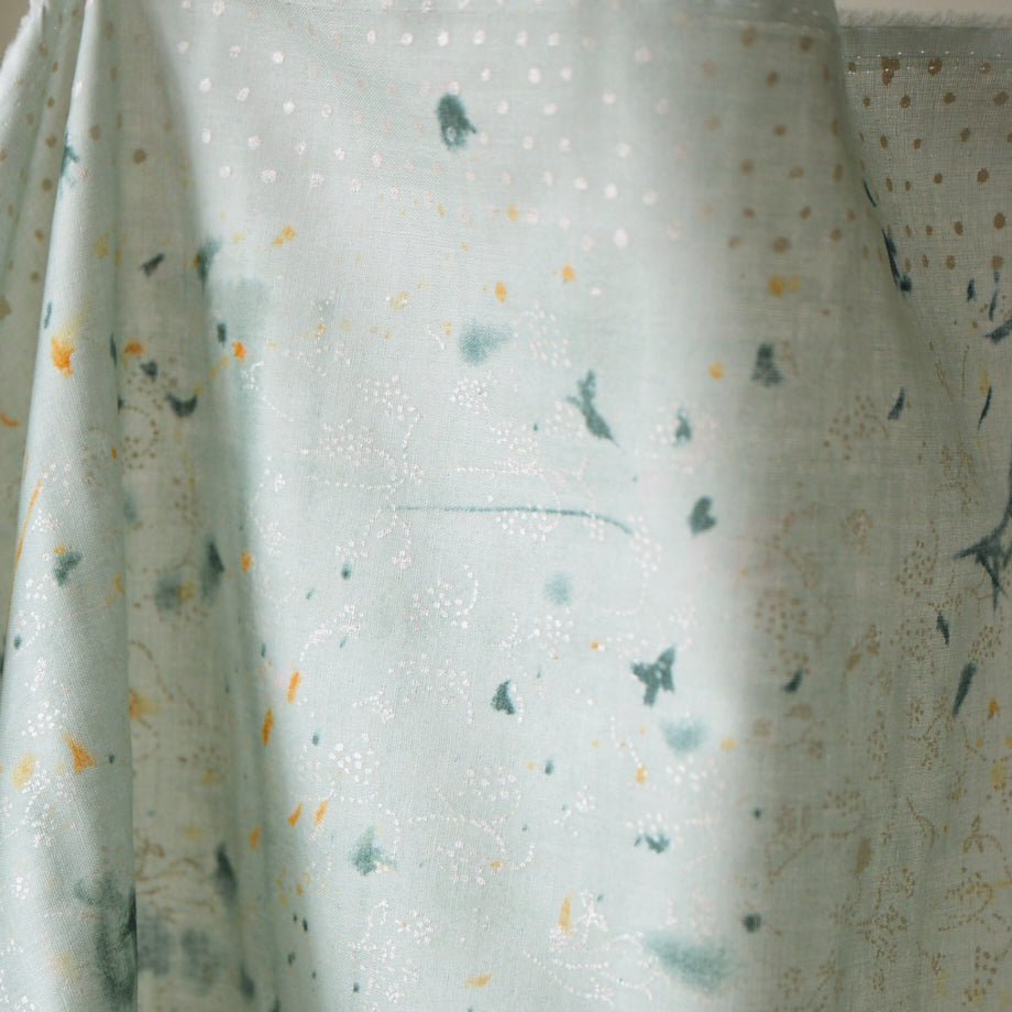 Blooming spring and fruitful autumn—like layering joyful memories, their timelines are woven together in this textile. The 'Flowers Bloom' pattern is printed with a delicate overlay of 'Bear Fruits'.